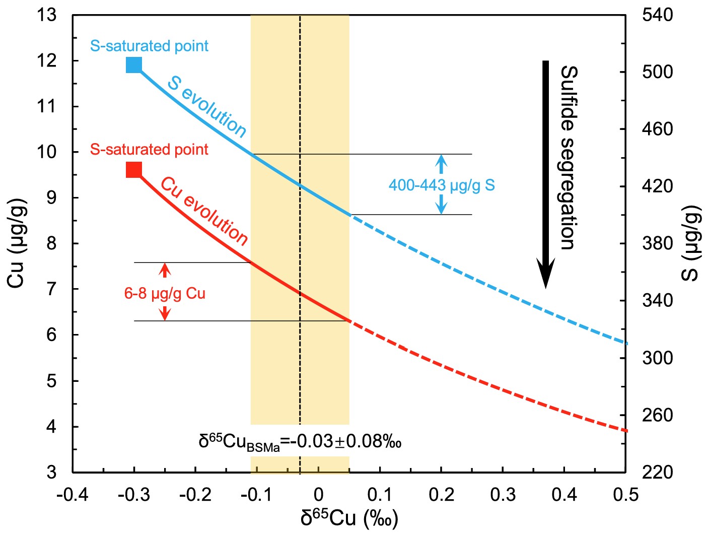 Based on copper isotope constraints, this study estimates an upper limit for the martian mantle sulfur abundance of 400–443 μg/g, with a corresponding copper abundance of 6–8 μg/g (Figure 2). This sulfur-poor character is consistent with the sulfur-undersaturated evolution history commonly observed in martian igneous rocks.