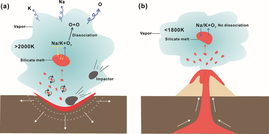 Schematic illustration of the contrasting behavior of volatile alkali metals during lunar hypervelocity impacts (>2000 K) versus volcanic eruptions (<1800 K). (Image by IGCAS)