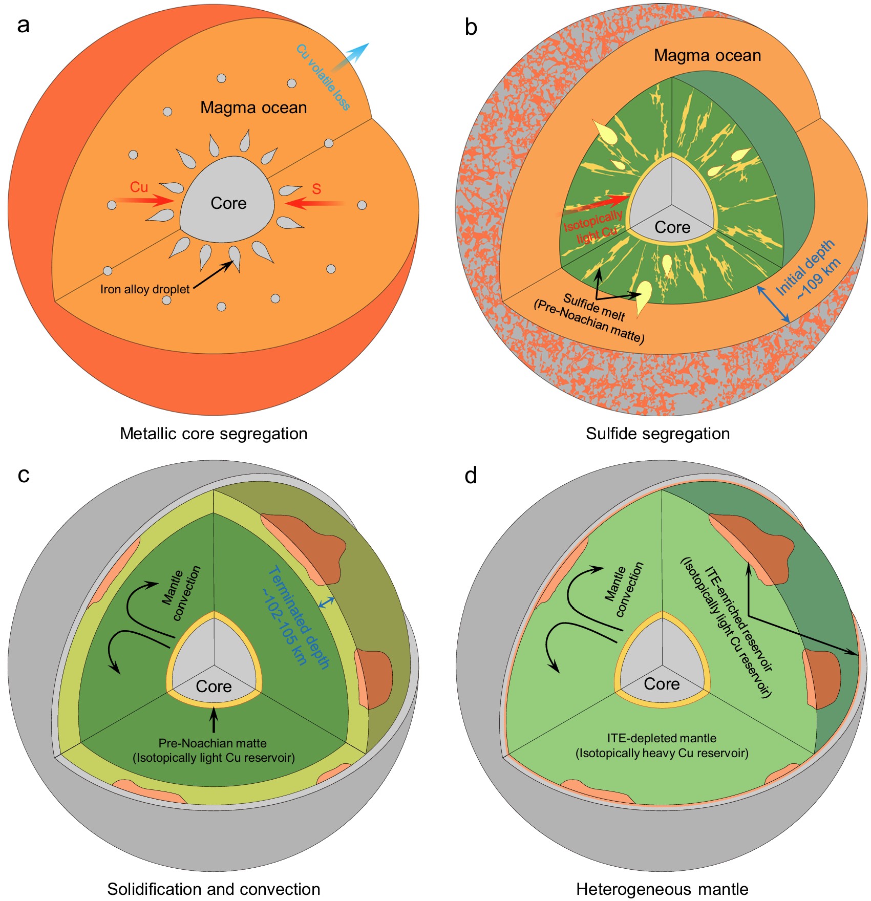 The study constructed a two-stage core formation model. Based on martian chondritic building blocks, the model first simulated the partitioning behavior of sulfur and copper and copper isotopic fractionation during metal core segregation, using the moderately volatile element potassium to assess the impact of volatile loss on copper content and isotopic composition. Subsequently, thermodynamic software (alphaMELTS 1.9) was used to model the evolution of major elements during martian magma ocean crystallization. Combined with a parameterization model for sulfur content at sulfide saturation (SCSS), the timing of sulfide melt exsolution was determined. The results indicate that sulfide saturation occurred when the magma ocean reached ~89% crystallization, triggering the formation of sulfide melts that began migrating towards the core. However, copper isotope constraints reveal that when the residual magma ocean shallowed to depths of less than approximately 102–105 km, the associated lower temperatures inhibited the downward percolation of sulfide melts. Although sulfide melts that formed at even shallower residual melt could still migrate downward, they were unable to reach the core and instead became trapped within the Martian silicate mantle. This mechanism resulted in the silicate mantle being enriched in heavier copper isotopes, and subsequent inefficient mantle convection contributed to the formation of a heterogeneous martian mantle (Figure 1).